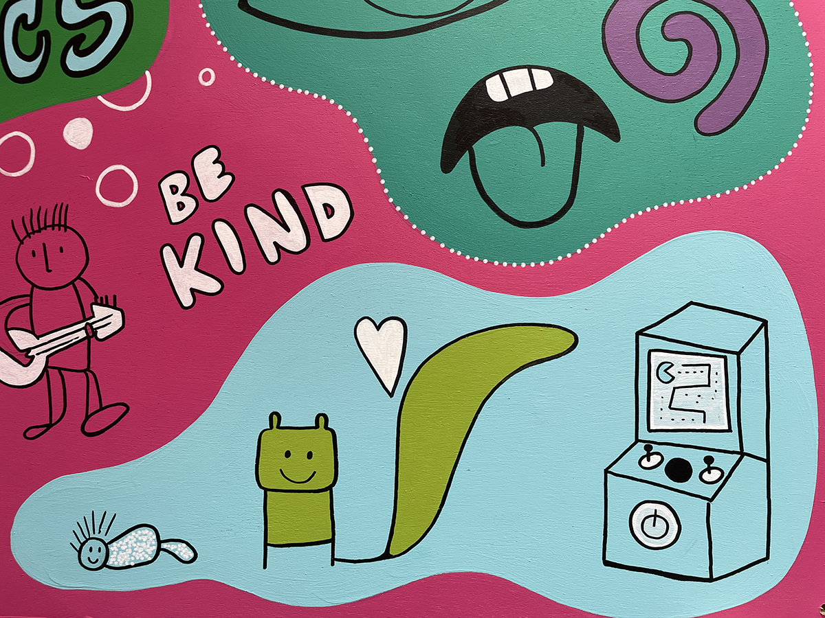 New Scot and native Scot families came together to draw, collage, play and even make music together! It was an absolute pleasure to create this vibrant mural from their designs and ideas.